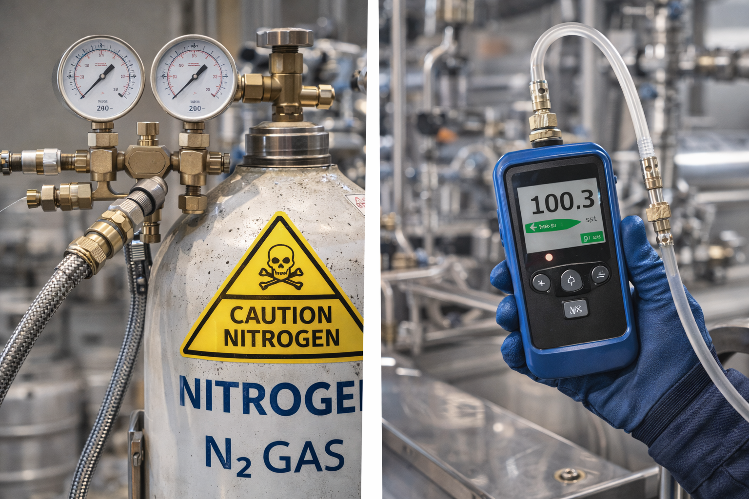 Азот инертен, но опасен тем, что вытесняет кислород и может привести к удушью без запаха и “предупреждений”. Кроме того, при опрессовке есть риск травм из-за энергии сжатого газа.